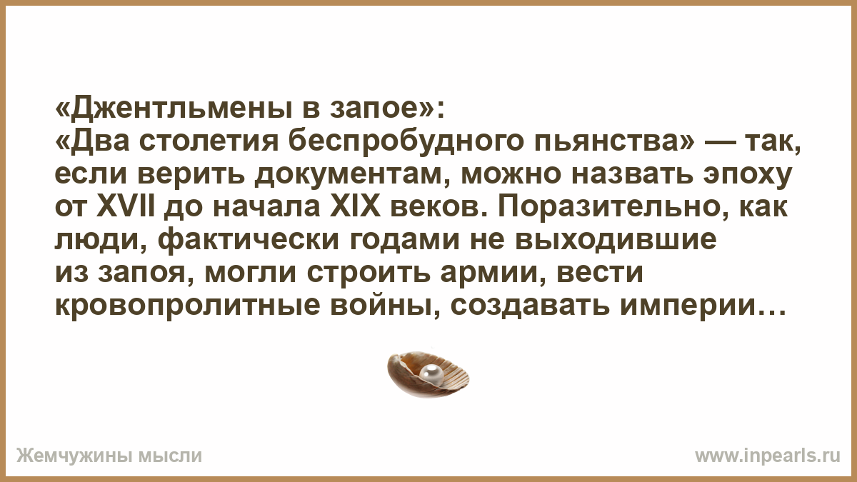 Лидерами в поклонении зеленому змию считались в ту пору англичане, но управлять колониальной империей им это совсем не мешало. Рубеж XVIII–XIX веков стал эпохой подъёма в экономике и роста могущества Англии. При этом Уильям Питт-старший, глава британского кабинета в 1766–1768 годах, был известен тем, что мог пойти выступать перед депутатами, надравшись, и наблевать на пол Вестминстерского дворца. На карьере премьера это никак не отражалось. Да и о кабинете Питта говорили, что единственным качеством, объединявшем политиков в его составе, было умение хорошенько выпить.