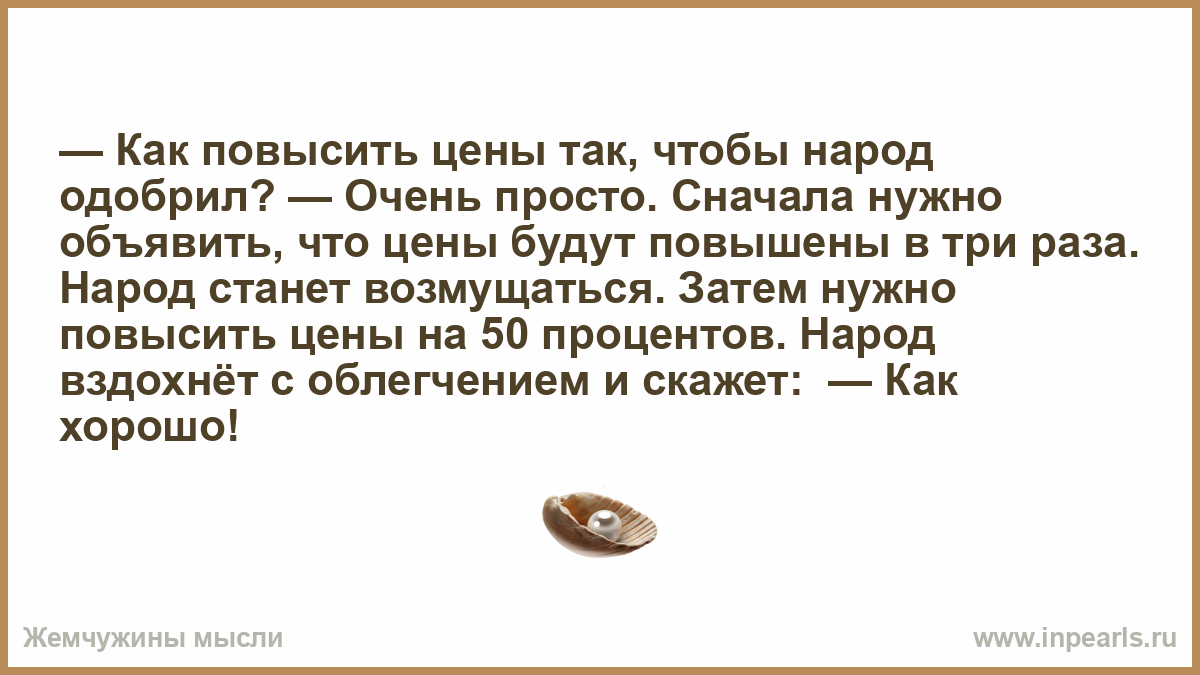 — Как повысить цены так, чтобы народ одобрил? — Очень просто. Сначала нужно объявить, что цены будут повышены в три раза. Народ станет возмущаться. Затем нужно повысить цены на 50 процентов. Народ вздохнёт с облегчением и скажет:  — Как хорошо!