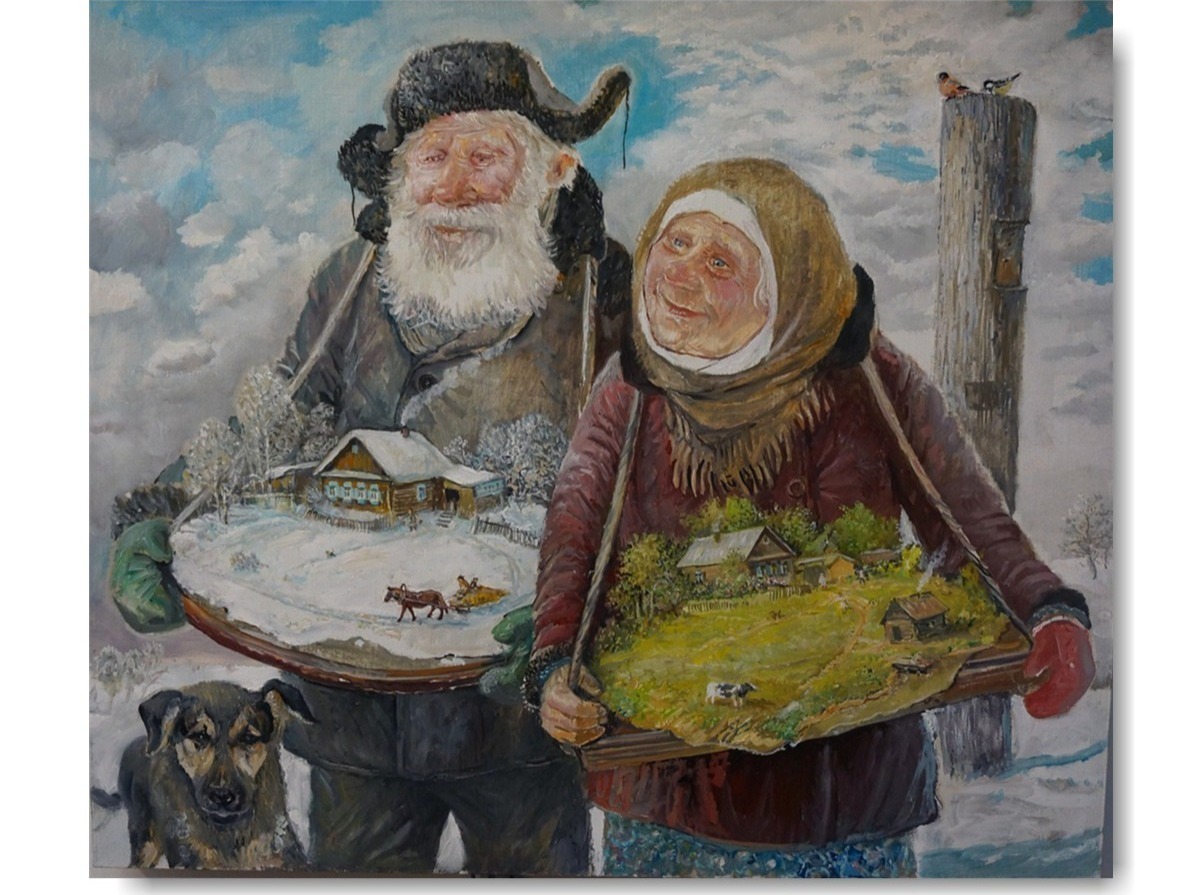 Картина Леонида Баранова «У тебя зима, а у меня лето» изображает пожилую пару, стоящую на фоне зимнего пейзажа.