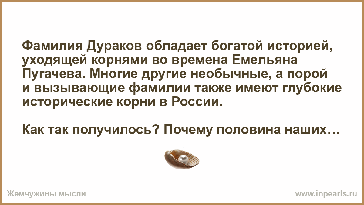 Фамилия Дураков обладает богатой историей, уходящей корнями во времена Емельяна Пугачева. Многие другие необычные, а порой и вызывающие фамилии также имеют глубокие исторические корни в России.