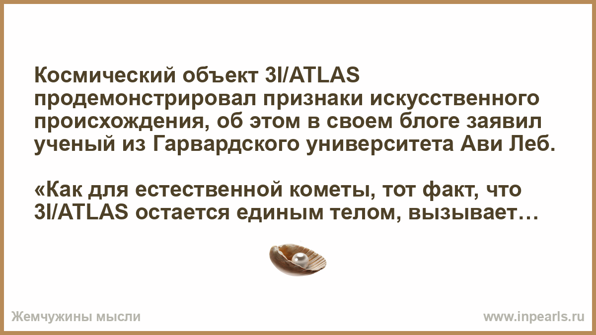 Космический объект 3I/ATLAS продемонстрировал признаки искусственного происхождения, об этом в своем блоге заявил ученый из Гарвардского университета Ави Леб.