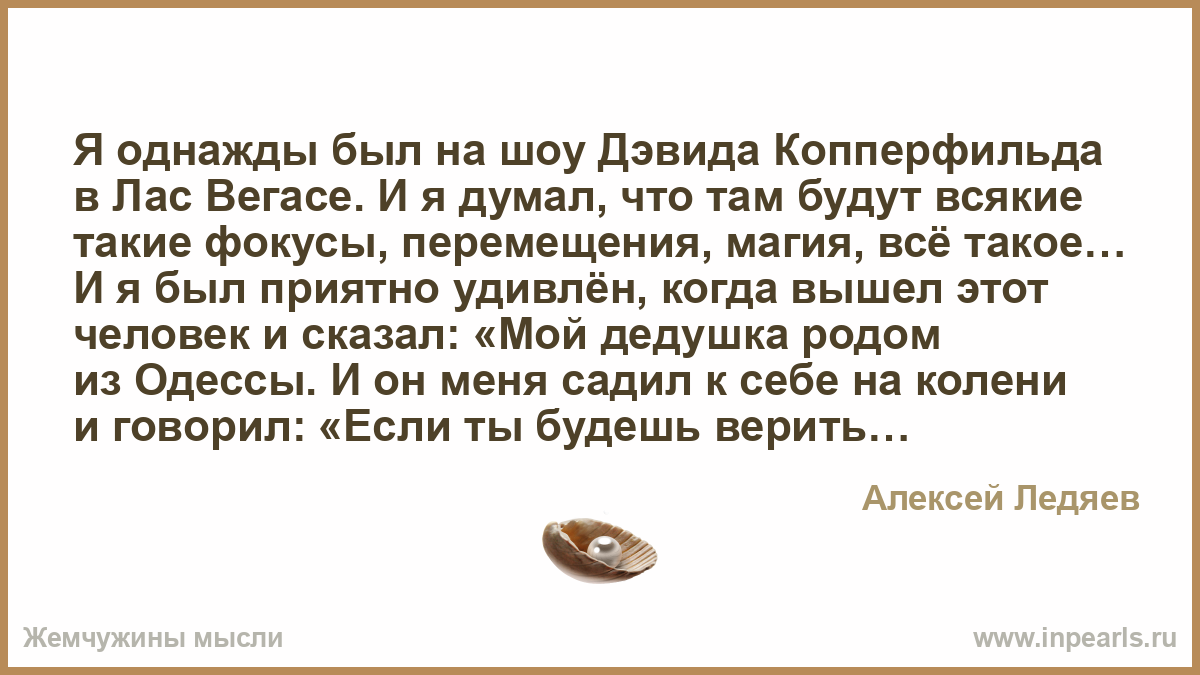 И я был приятно удивлён, когда вышел этот человек и сказал: «Мой дедушка родом из Одессы. И он меня садил к себе на колени и говорил: «Если ты будешь верить в невозможное, тогда бы будешь победителем». И я помню эту заповедь моего деда до сих пор». И Копперфильд начал говорить о вере!