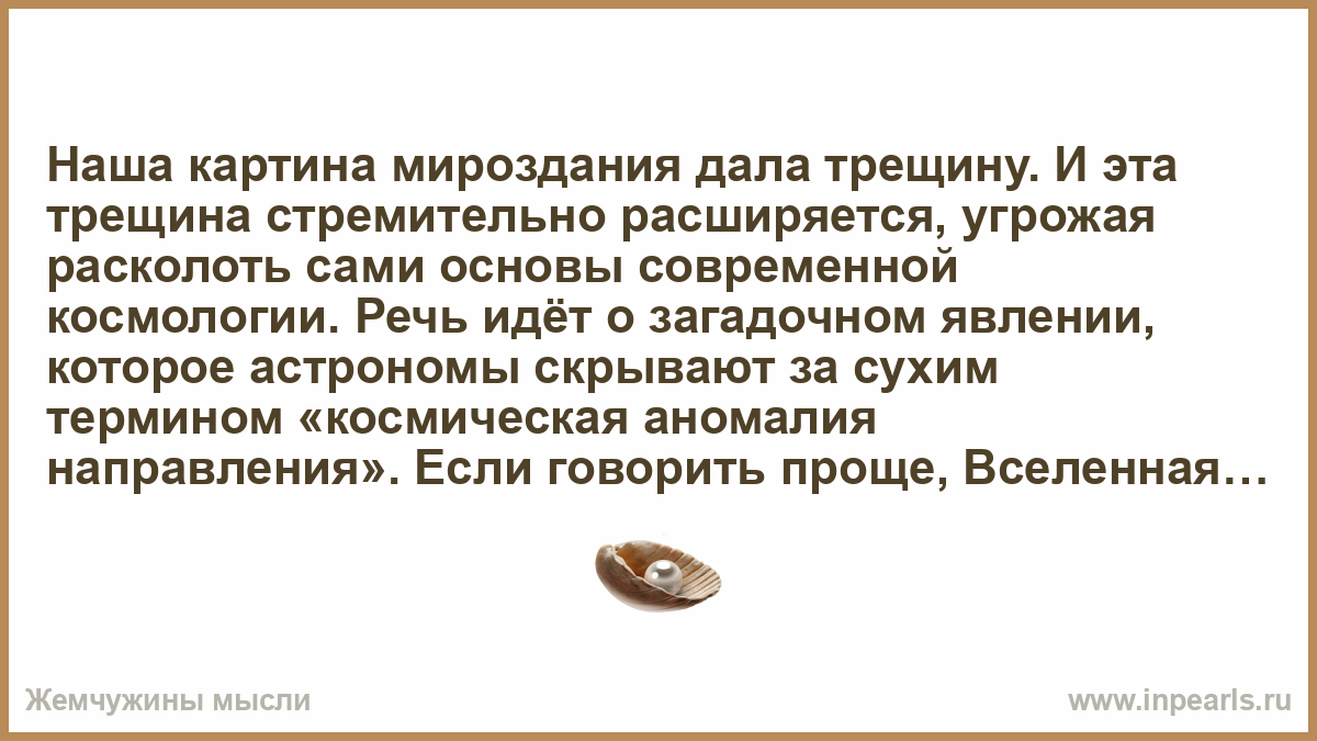 Наша картина мироздания дала трещину. И эта трещина стремительно расширяется, угрожая расколоть сами основы современной космологии. Речь идёт о загадочном явлении, которое астрономы скрывают за сухим термином «космическая аномалия направления». Если говорить проще, Вселенная в самых больших масштабах движется не так, как предписывают фундаментальные законы. Она «плывёт не туда».