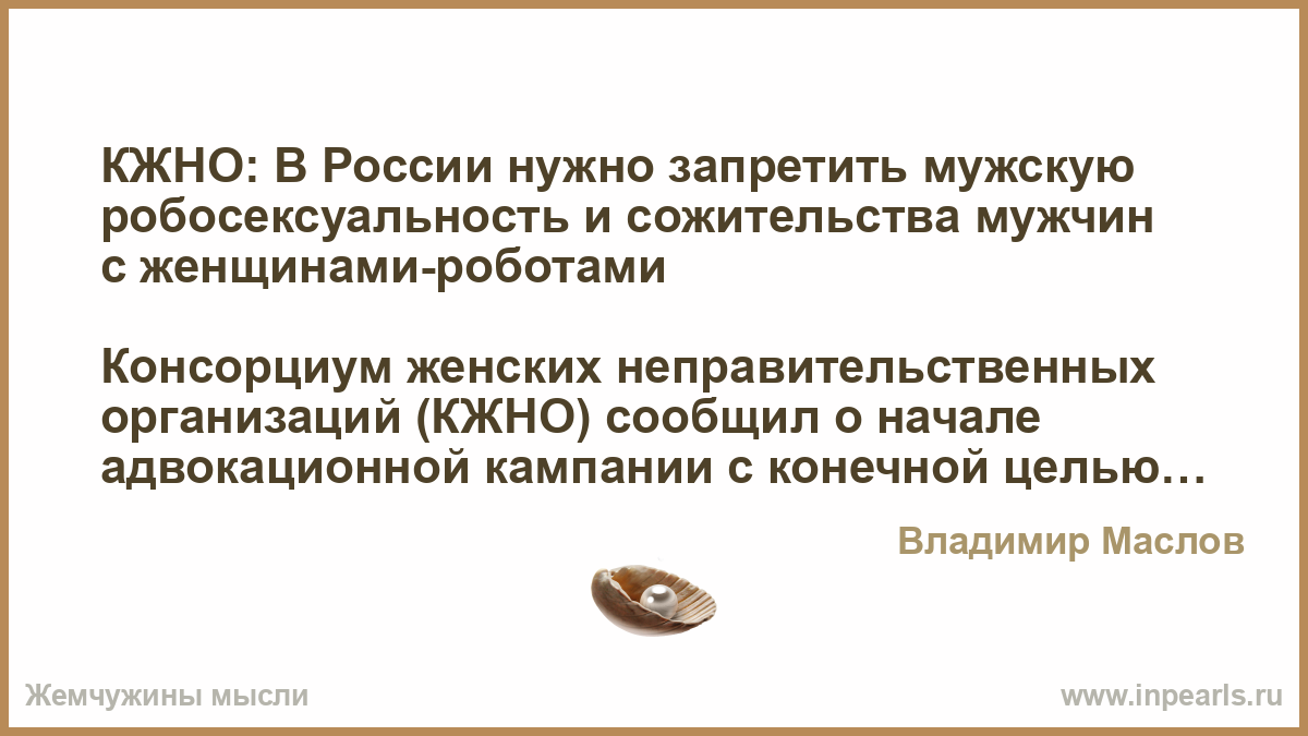 Консорциум женских неправительственных организаций (КЖНО) сообщил о начале адвокационной кампании с конечной целью запрета в России мужской робосексуальности и сожительства мужчин с роботами-женщинами, первая краткосрочная задача это лоббизм принятия закона о запрете пропаганды этого аморального и деструктивного явления. Как отметила соосновательница и президент КЖНО Ана Яковлевна Медман-Инденбаум, мужская робосексуальность и «семьи» с робо-женщинами несут экзистенциальную угрозу реализации прав женщин, нарушают Указ Президента о сохранении традиционных ценностей, нивелируют национальный проект «Семья» и Национальную стратегию действий в интересах женщин на 20232030 годы, а также значительно усложняют реализацию целей Стратегии действий по реализации семейной и демографической политики, поддержке многодетности в России до 2036 года.