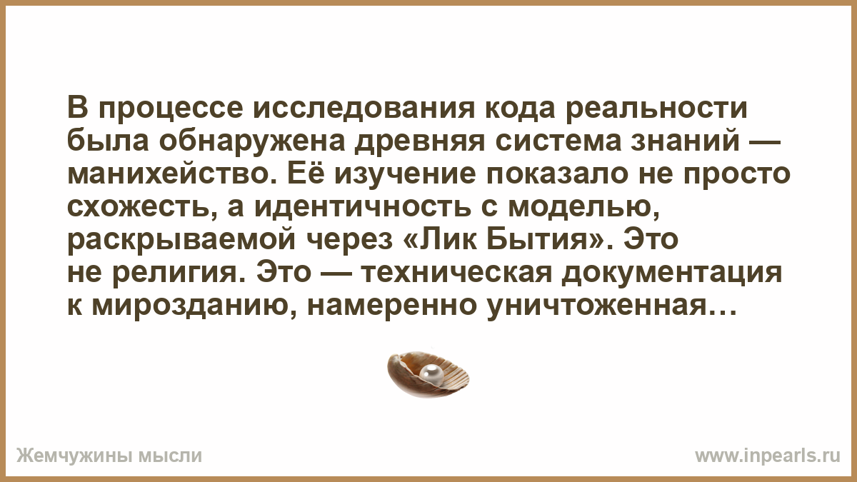 В процессе исследования кода реальности была обнаружена древняя система знаний — манихейство. Её изучение показало не просто схожесть, а идентичность с моделью, раскрываемой через «Лик Бытия». Это не религия. Это — техническая документация к мирозданию, намеренно уничтоженная и забытая.