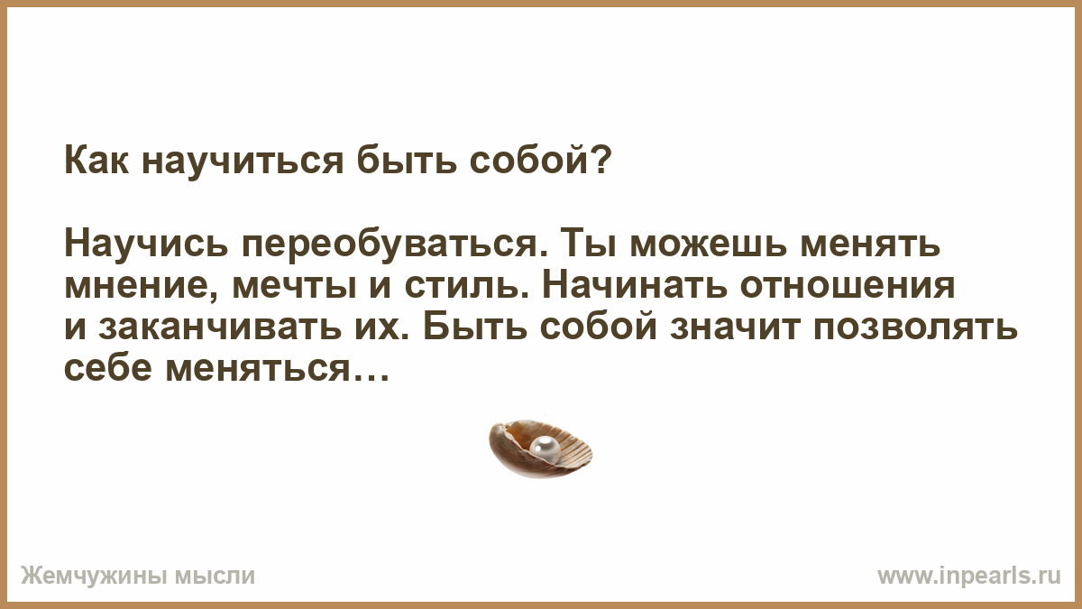 Научись переобуваться. Ты можешь менять мнение, мечты и стиль. Начинать отношения и заканчивать их. Быть собой значит позволять себе меняться