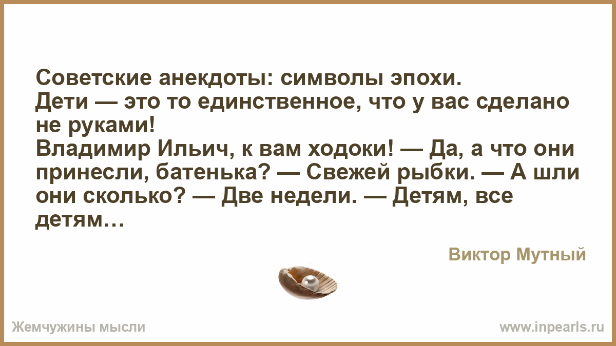 Владимир Ильич, к вам ходоки! — Да, а что они принесли, батенька? — Свежей рыбки. — А шли они сколько? — Две недели. — Детям, все детям.