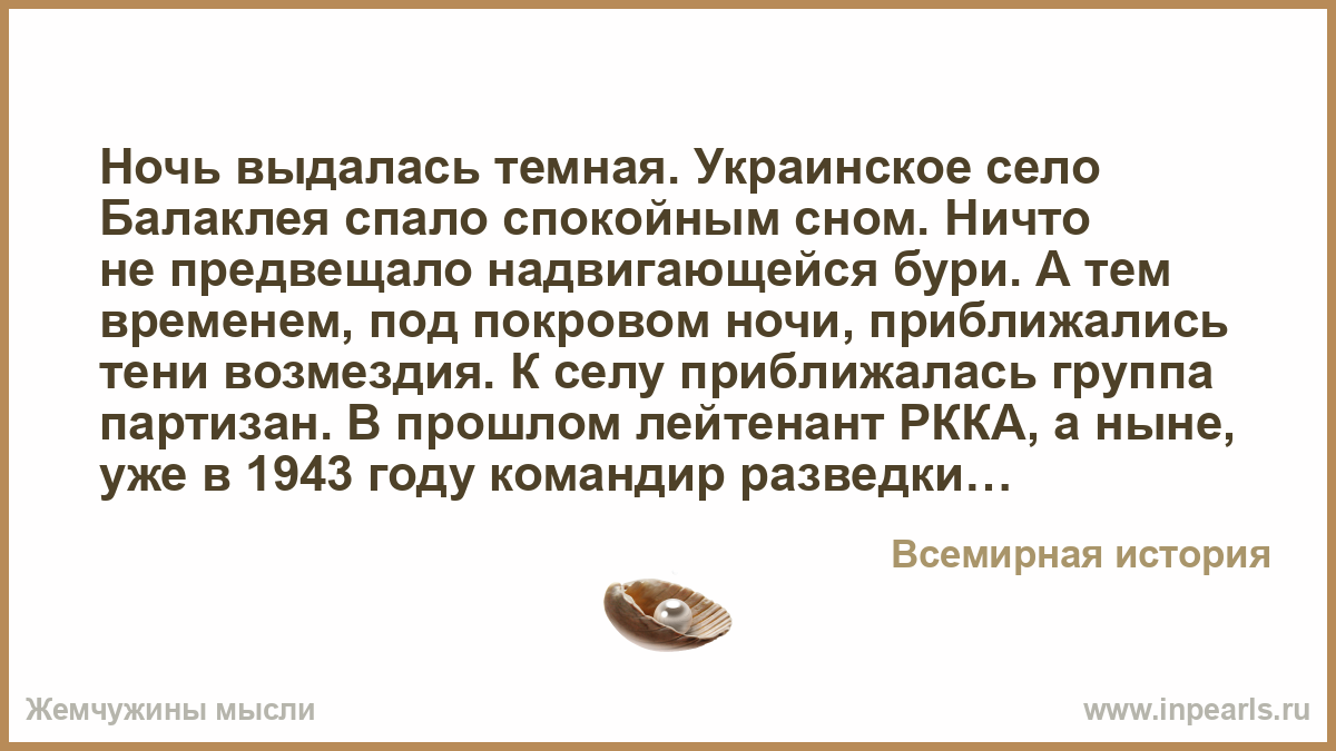 Ночь выдалась темная. Украинское село Балаклея спало спокойным сном. Ничто не предвещало надвигающейся бури. А тем временем, под покровом ночи, приближались тени возмездия. К селу приближалась группа партизан. В прошлом лейтенант РККА, а ныне, уже в 1943 году командир разведки партизанского отряда Леонид Ефимович Беренштейн, уже бывал здесь. И теперь его сюда вела жажда мщенья. В одном из домов спокойно восседает Шатайло, тот самый, который в 1941 году перешел к немцам. У Леонида Ефимовича с ним давние счеты.