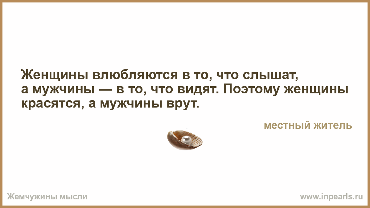 Женщины влюбляются в то, что слышат, а мужчины — в то, что видят. Поэтому женщины красятся, а мужчины врут.