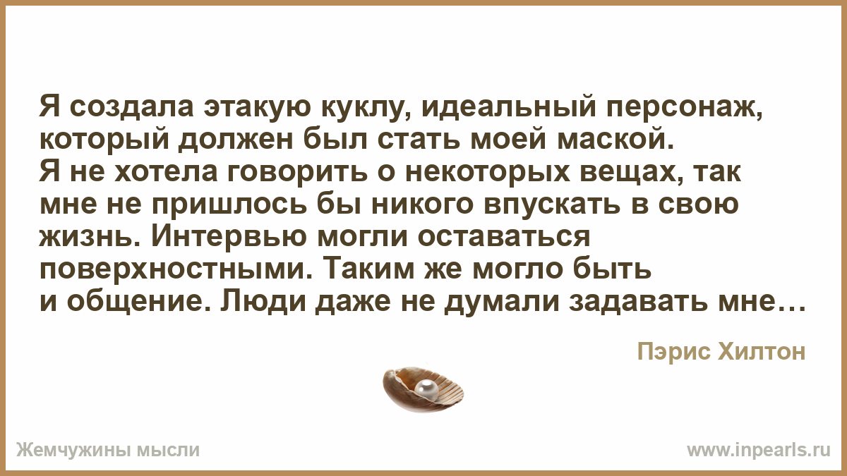 Я создала этакую куклу, идеальный персонаж, который должен был стать моей маской. Я не хотела говорить о некоторых вещах, так мне не пришлось бы никого впускать в свою жизнь. Интервью могли оставаться поверхностными. Таким же могло быть и общение. Люди даже не думали задавать мне какие-либо травмирующие вопросы. Так что это была такая защита от боли.