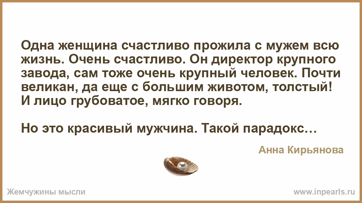 Одна женщина счастливо прожила с мужем всю жизнь. Очень счастливо. Он директор крупного завода, сам тоже очень крупный человек. Почти великан, да еще с большим животом, толстый! И лицо грубоватое, мягко говоря.