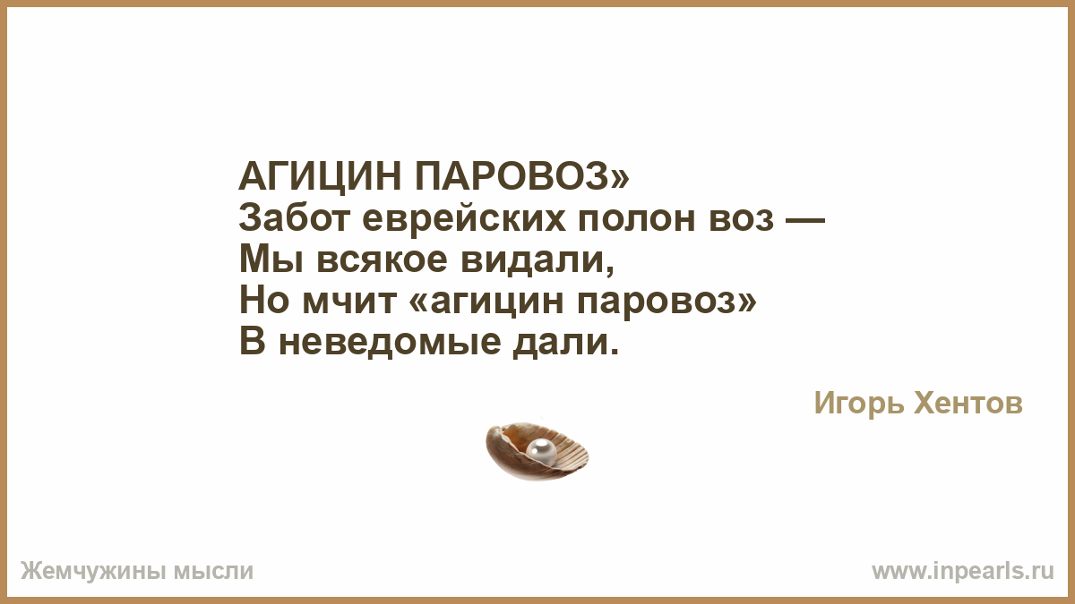 Здесь по столу размазывают кашу, А там забот-хлопот нетронут воз — Скажу, как говорили предки наши: «Лети вперёд, агицин паровоз!»