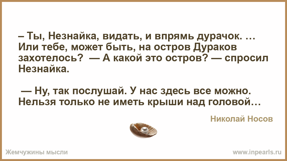 – Ты, Незнайка, видать, и впрямь дурачок. … Или тебе, может быть, на остров Дураков захотелось? — А какой это остров? — спросил Незнайка.