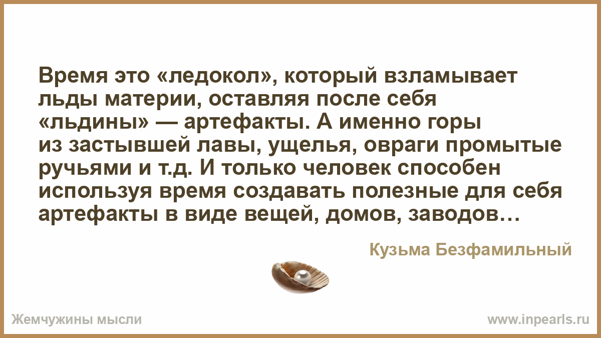 Время это «ледокол», который взламывает льды материи, оставляя после себя «льдины» — артефакты. А именно горы из застывшей лавы, ущелья, овраги промытые ручьями и т.д. И только человек способен используя время создавать полезные для себя артефакты в виде вещей, домов, заводов и других культурных проявлений своей деятельности.