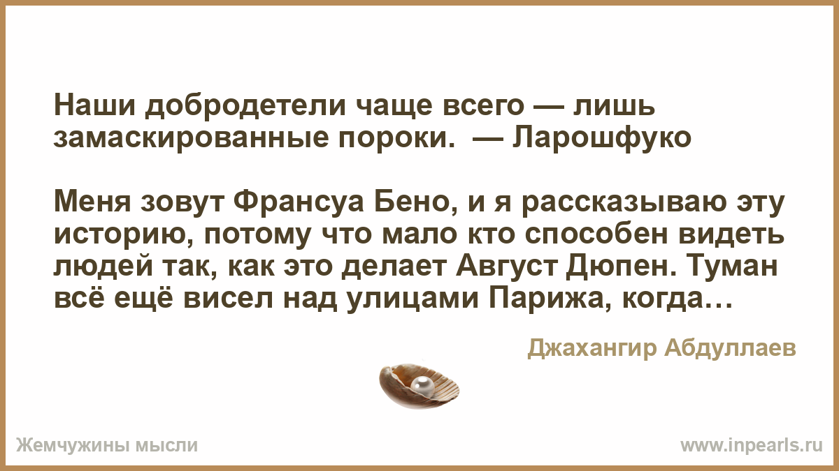 — И вот, Франсуа, — сказал Дюпен, — истина всегда проявляется в деталях. Добродетель часто — маска, но преступление выдаёт себя телодвижениями, мимикой, тонким напряжением. Истинная добродетель почти никогда не выглядит как добродетель.