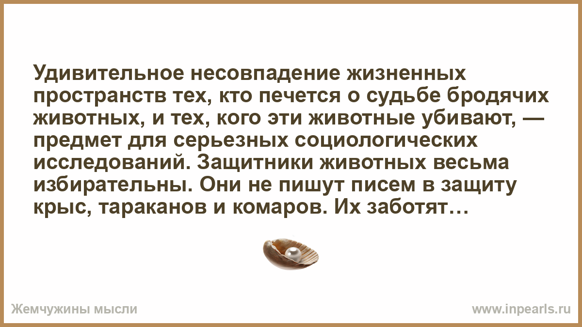 Как не перестанут делать это и домашние собаки, которые каждый день тысячами, миллионами выходят на улицу гулять со своими «хозяевами». Я никогда не видел собачье дерьмо на улицах Парижа или Рима. Зато я видел там людей, которые убирают это самое дерьмо за своими собаками и выбрасывают его в урну. Вы когда-нибудь видели такое в России? Кто-нибудь из тех защитников животных, которых я процитировал выше, делает это? Нет, разумеется.