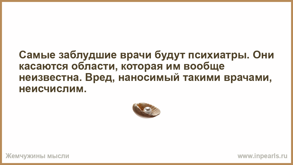 Самые заблудшие врачи будут психиатры. Они касаются области, которая им вообще неизвестна. Вред, наносимый такими врачами, неисчислим.