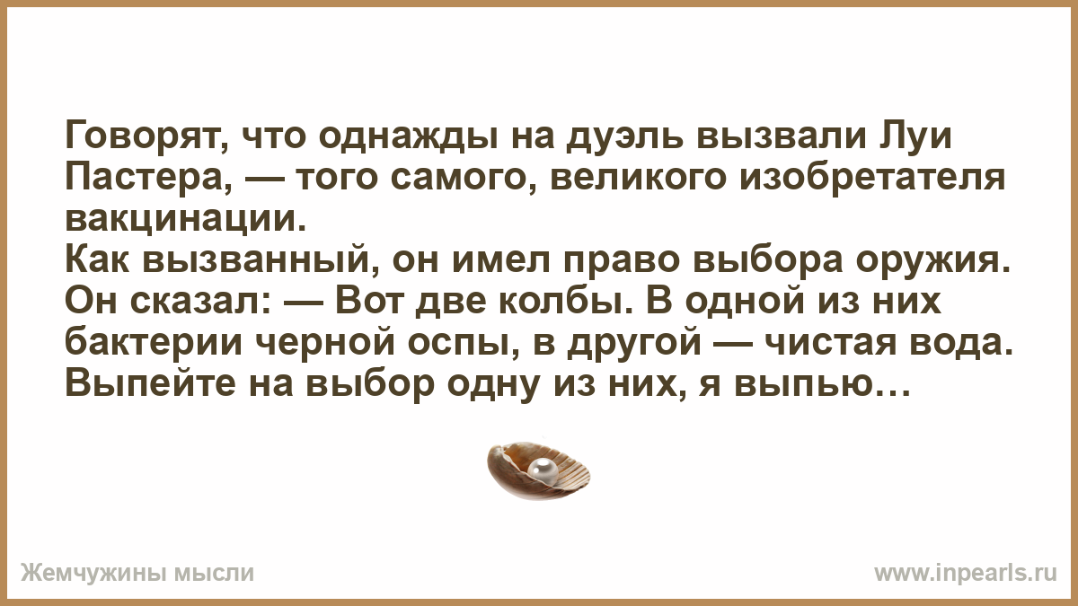 Говорят, что однажды на дуэль вызвали Луи Пастера, — того самого, великого изобретателя вакцинации.