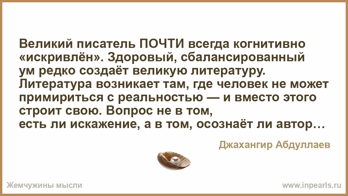 Великий писатель ПОЧТИ всегда когнитивно «искривлён». Здоровый, сбалансированный ум редко создаёт великую литературу. Литература возникает там, где человек не может примириться с реальностью — и вместо этого строит свою. Вопрос не в том, есть ли искажение, а в том, осознаёт ли автор, что его зрение — не весь мир, а только его трагически честный фрагмент