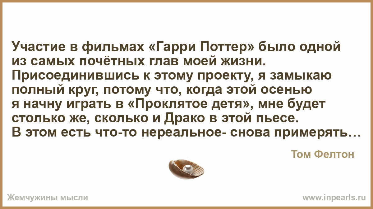 Участие в фильмах «Гарри Поттер» было одной из самых почётных глав моей жизни. Присоединившись к этому проекту, я замыкаю полный круг, потому что, когда этой осенью я начну играть в «Проклятое детя», мне будет столько же, сколько и Драко в этой пьесе. В этом есть что-то нереальное- снова примерять на себя его образ и, конечно же, его знаменитые платиново-белокурые волосы, и я очень взволнован от того, что смогу довести до конца его историю и поделиться ею с величайшим фанатским сообществом в мире. Я с нетерпением жду, когда присоединюсь к этой невероятной компании и стану частью бродвейского сообщества.