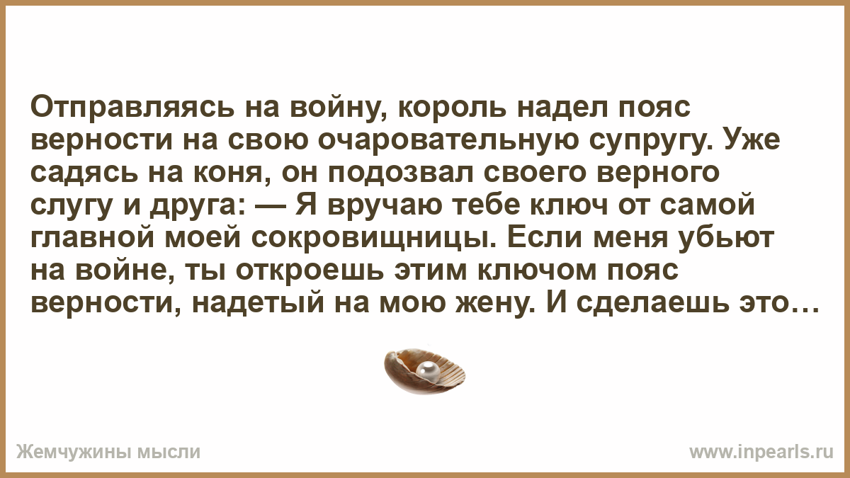 Отправляясь на войну, король надел пояс верности на свою очаровательную супругу. Уже садясь на коня, он подозвал своего верного слугу и друга: — Я вручаю тебе ключ от самой главной моей сокровищницы. Если меня убьют на войне, ты откроешь этим ключом пояс верности, надетый на мою жену. И сделаешь это ровно через год после моей смерти. Только тебе я могу доверить этот ключ, ибо не сомневаюсь в твоей честности и благородстве.