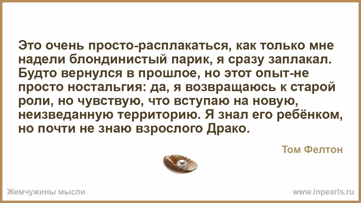 Это очень просто-расплакаться, как только мне надели блондинистый парик, я сразу заплакал. Будто вернулся в прошлое, но этот опыт-не просто ностальгия: да, я возвращаюсь к старой роли, но чувствую, что вступаю на новую, неизведанную территорию. Я знал его ребёнком, но почти не знаю взрослого Драко.