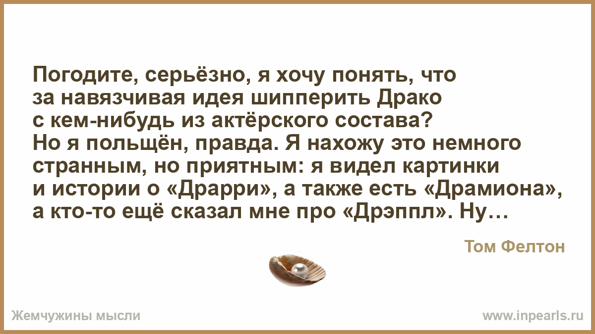 Погодите, серьёзно, я хочу понять, что за навязчивая идея шипперить Драко с кем-нибудь из актёрского состава? Но я польщён, правда. Я нахожу это немного странным, но приятным: я видел картинки и истории о «Драрри», а также есть «Драмиона», а кто-то ещё сказал мне про «Дрэппл». Ну, давайте просто «Драко и Яблоко» (смеётся). Нет, серьёзно! Это фантастика! Не поймите меня неправильно, я считаю, что вы, ребята, такие творческие.