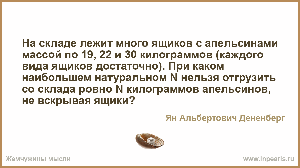 На складе лежит много ящиков с апельсинами массой по 19, 22 и 30 килограммов (каждого вида ящиков достаточно). При каком наибольшем натуральном N нельзя отгрузить со склада ровно N килограммов апельсинов, не вскрывая ящики?