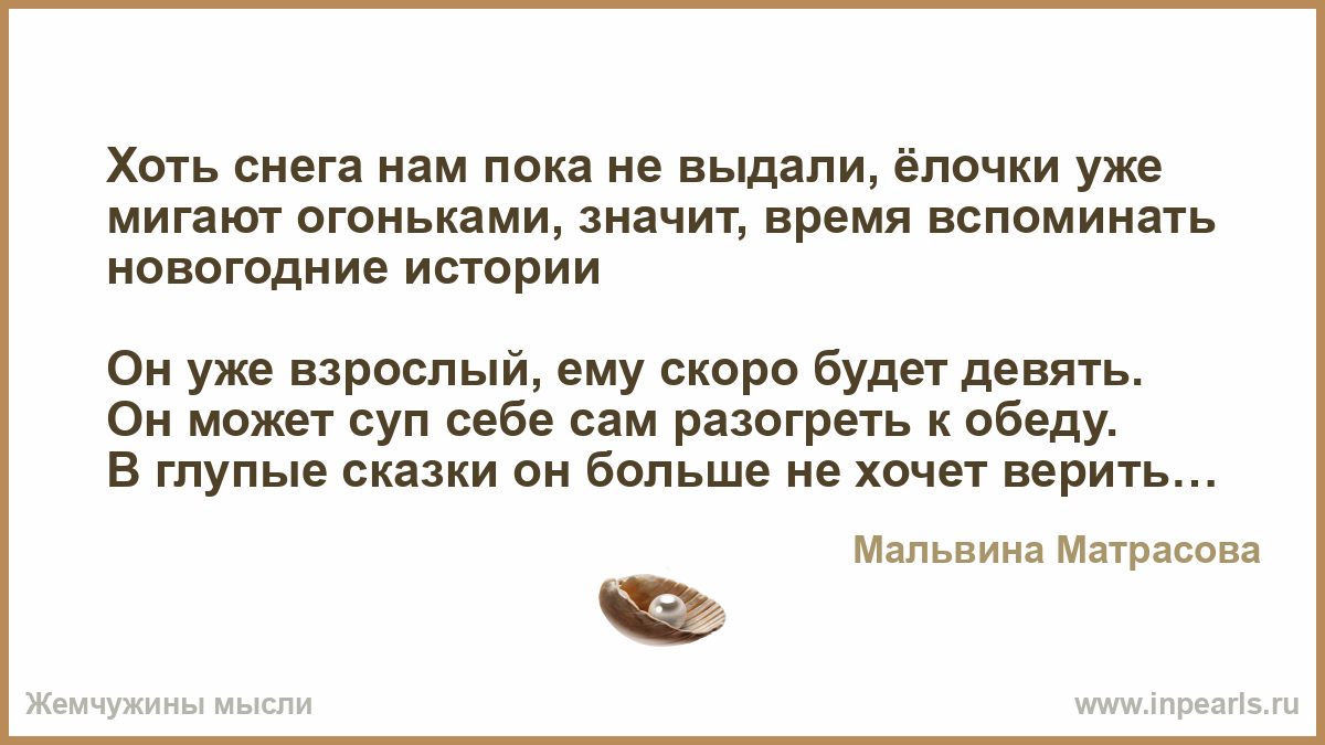 Он уже взрослый, ему скоро будет девять. Он может суп себе сам разогреть к обеду. В глупые сказки он больше не хочет верить, в прошлом году в дедморозе узнал соседа. Ёлку нарядит, а писем писать не будет. Он уже вырос, он умный, хороший мальчик, он понимает, что вряд ли дождётся чуда — мама не хочет кошечек и собачек.
