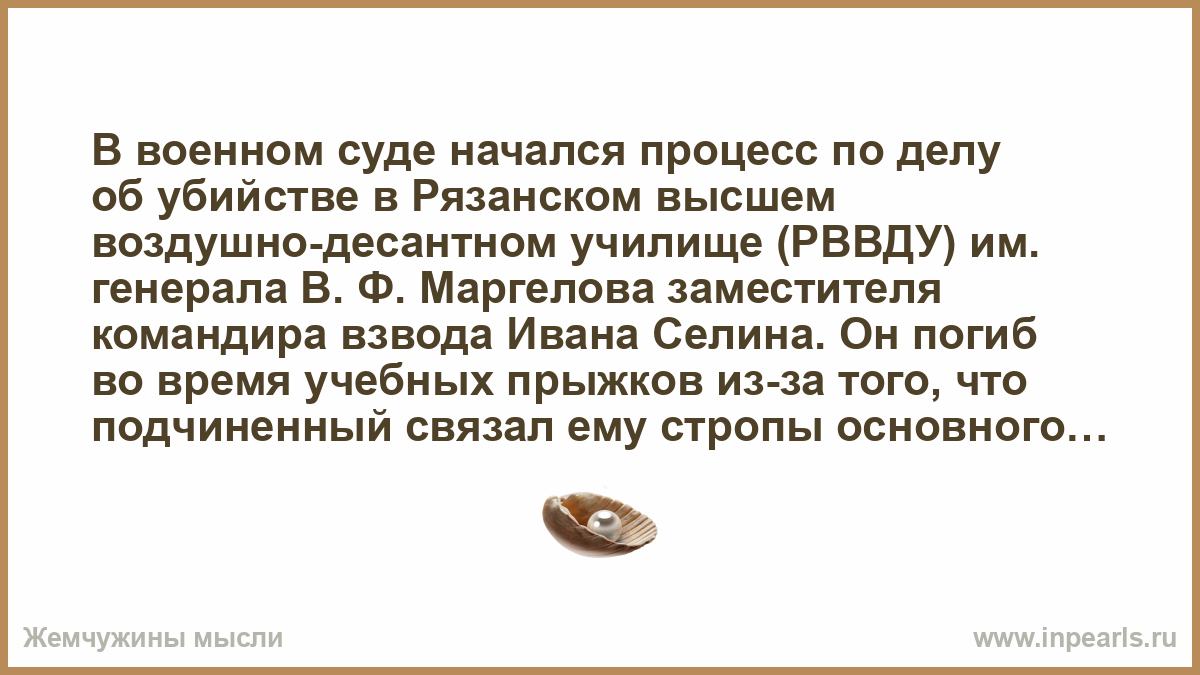 В военном суде начался процесс по делу об убийстве в Рязанском высшем воздушно-десантном училище (РВВДУ) им. генерала В. Ф. Маргелова заместителя командира взвода Ивана Селина. Он погиб во время учебных прыжков из-за того, что подчиненный связал ему стропы основного и запасного парашютов. Курсант взял всю вину на себя, однако потерпевшие — родные сержанта — не верят, что у подсудимого не было сообщников. Тем временем следствие начало проверку по факту халатности должностных лиц училища, а мать погибшего отсудила у военного ведомства моральную компенсацию — 2 млн руб.