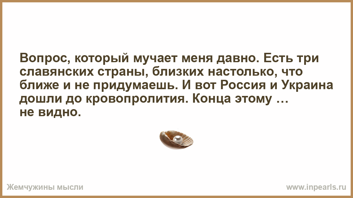Вопрос, который мучает меня давно. Есть три славянских страны, близких настолько, что ближе и не придумаешь. И вот Россия и Украина дошли до кровопролития. Конца этому … не видно.