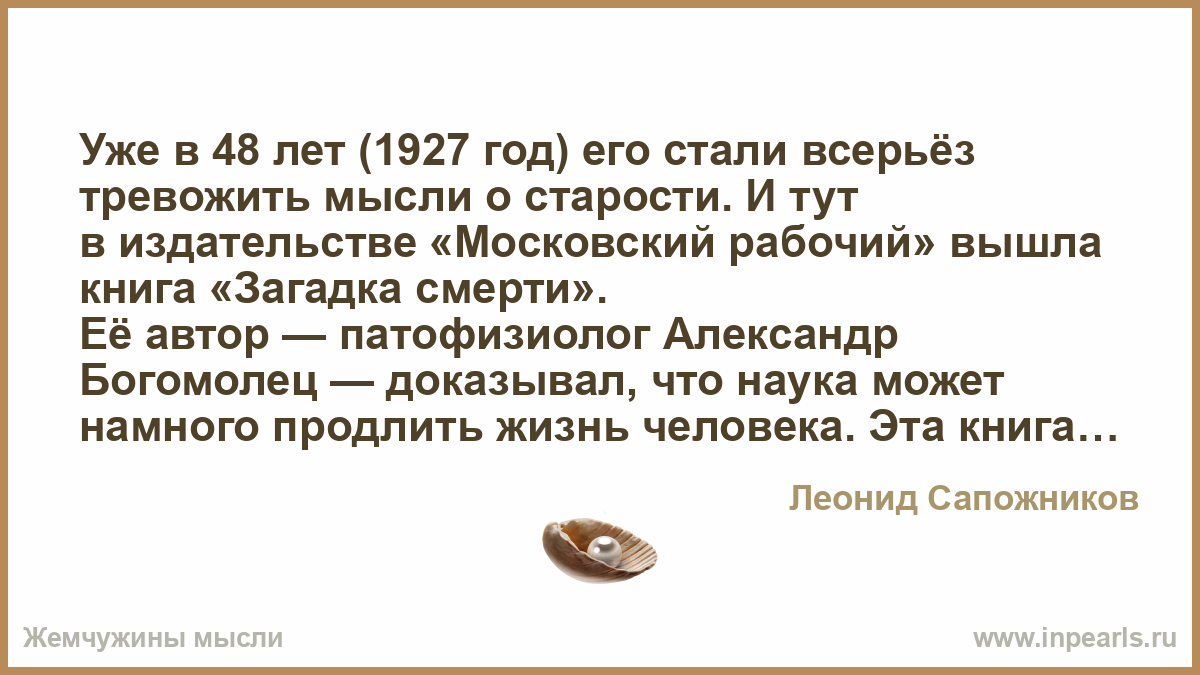 Уже в 48 лет (1927 год) его стали всерьёз тревожить мысли о старости. И тут в издательстве «Московский рабочий» вышла книга «Загадка смерти».