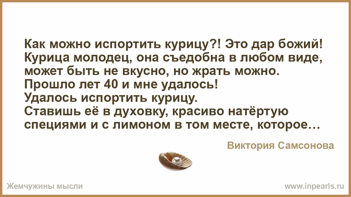 Ставишь её в духовку, красиво натёртую специями и с лимоном в том месте, которое у ней и жопа и желудок, как у моих бывших.