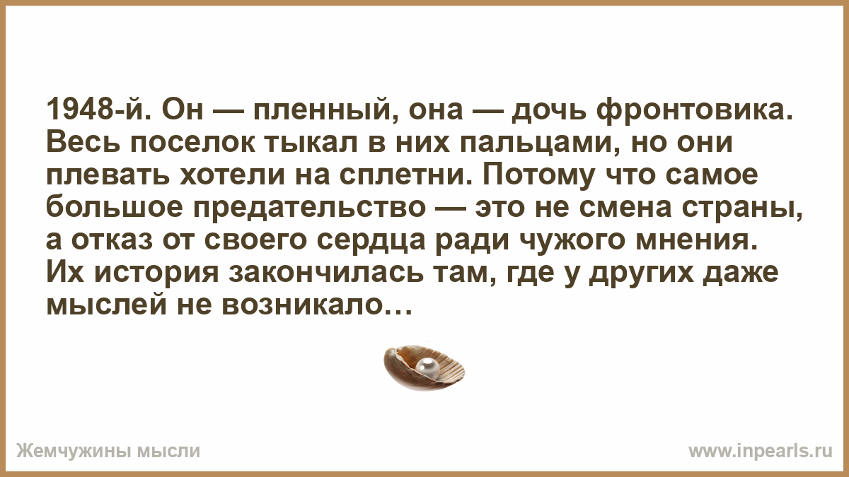1948-й. Он — пленный, она — дочь фронтовика. Весь поселок тыкал в них пальцами, но они плевать хотели на сплетни. Потому что самое большое предательство — это не смена страны, а отказ от своего сердца ради чужого мнения. Их история закончилась там, где у других даже мыслей не возникало
