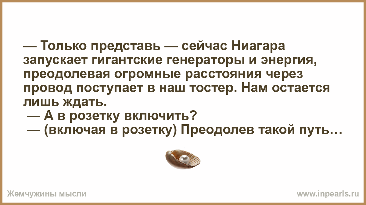 — Только представь — сейчас Ниагара запускает гигантские генераторы и энергия, преодолевая огромные расстояния через провод поступает в наш тостер. Нам остается лишь ждать.