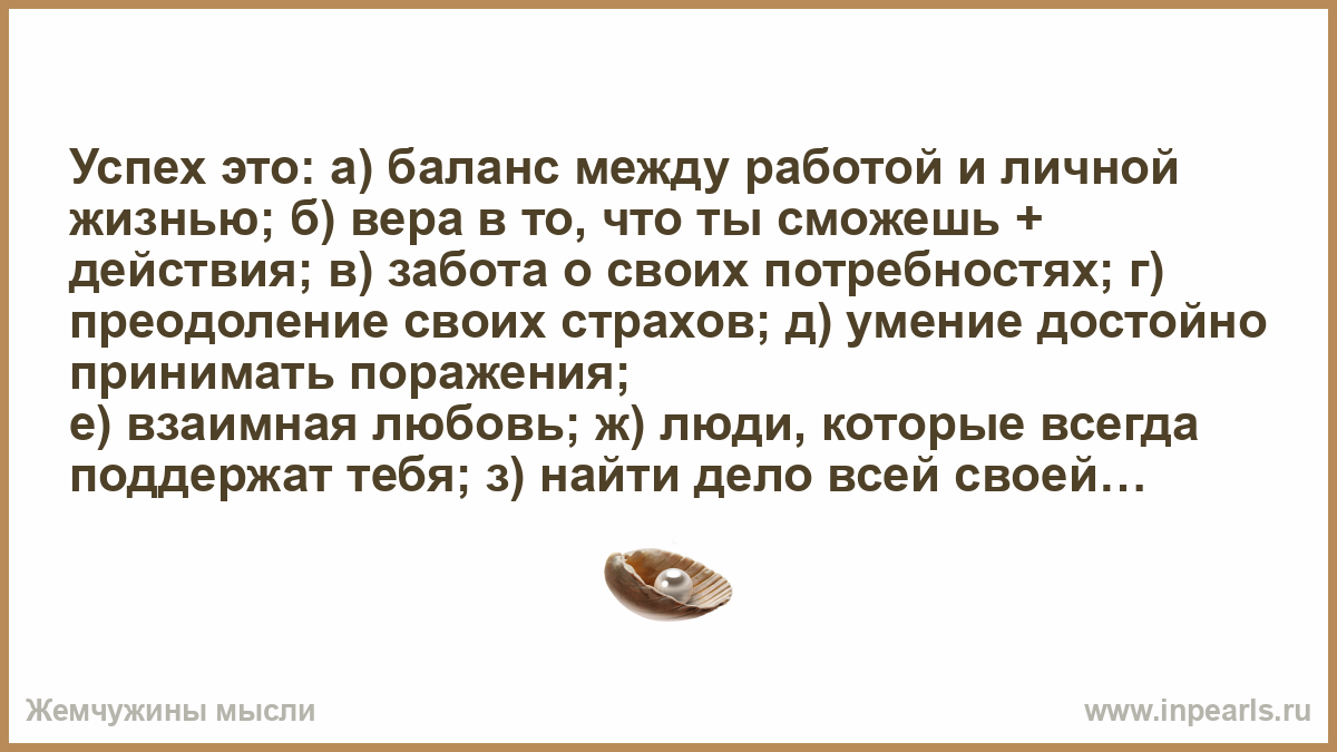 Успех это: а) баланс между работой и личной жизнью; б) вера в то, что ты сможешь + действия; в) забота о своих потребностях; г) преодоление своих страхов; д) умение достойно принимать поражения;