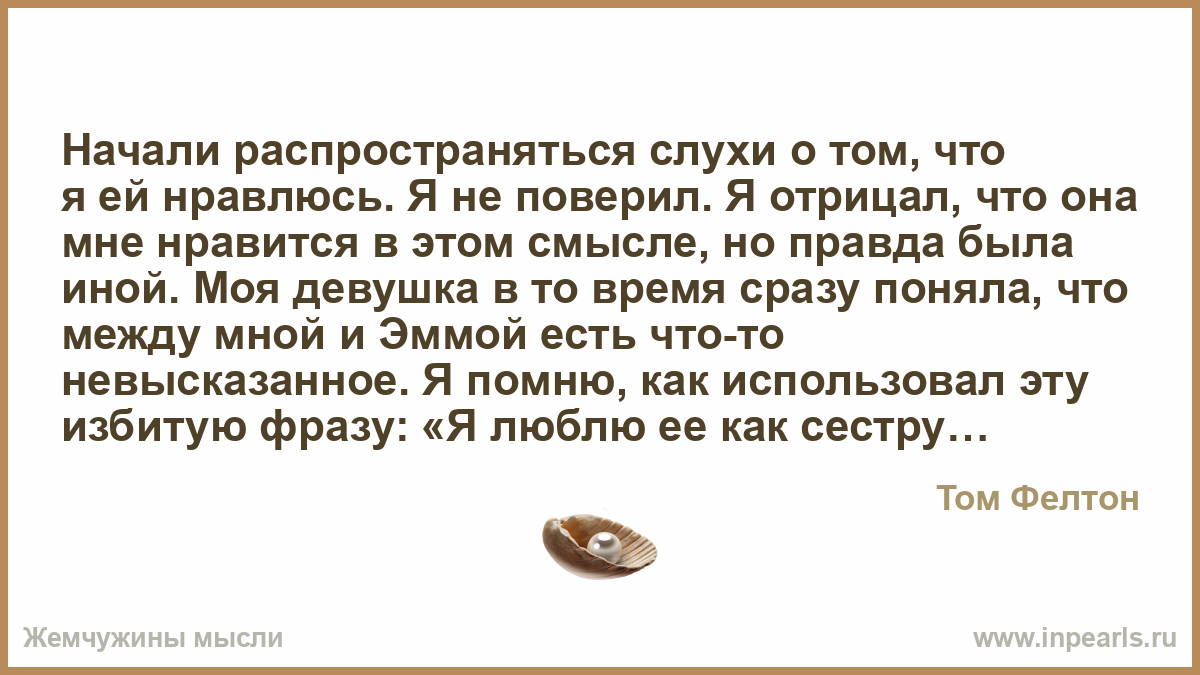 Начали распространяться слухи о том, что я ей нравлюсь. Я не поверил. Я отрицал, что она мне нравится в этом смысле, но правда была иной. Моя девушка в то время сразу поняла, что между мной и Эммой есть что-то невысказанное. Я помню, как использовал эту избитую фразу: «Я люблю ее как сестру», но дело было не только в этом.