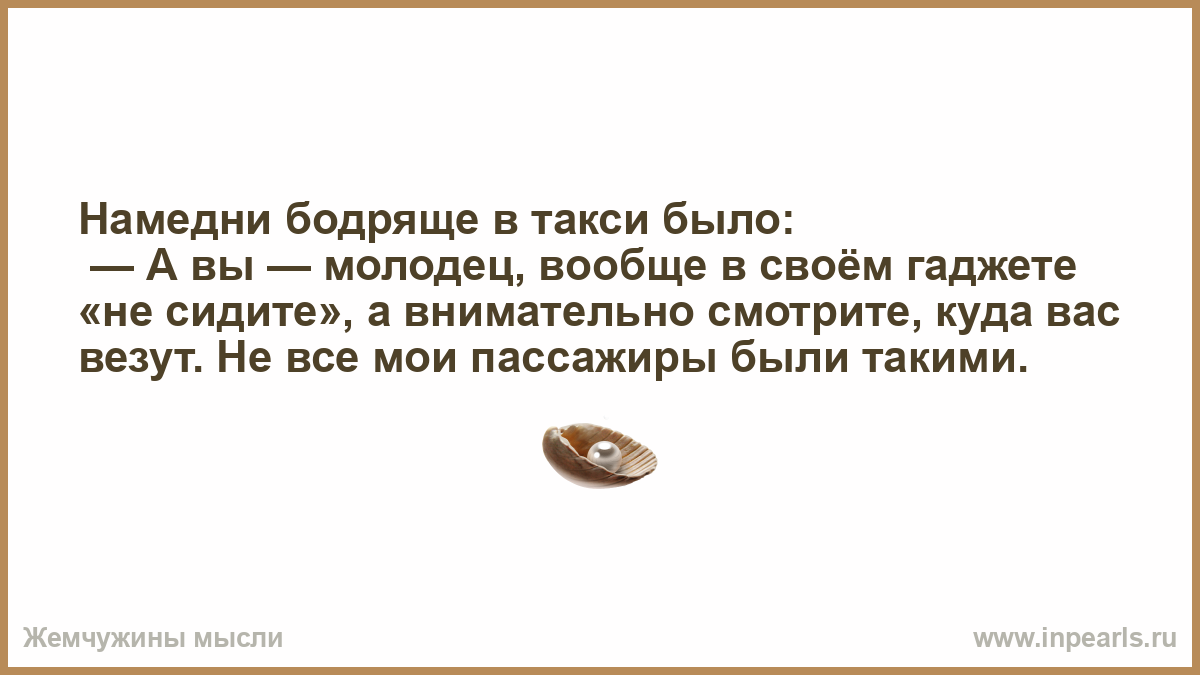 — А вы — молодец, вообще в своём гаджете «не сидите», а внимательно смотрите, куда вас везут. Не все мои пассажиры были такими.