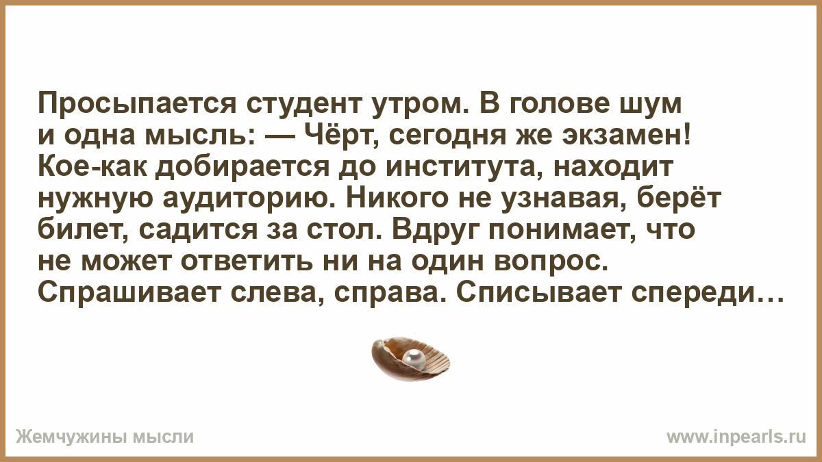 Просыпается студент утром. В голове шум и одна мысль: — Чёрт, сегодня же экзамен!