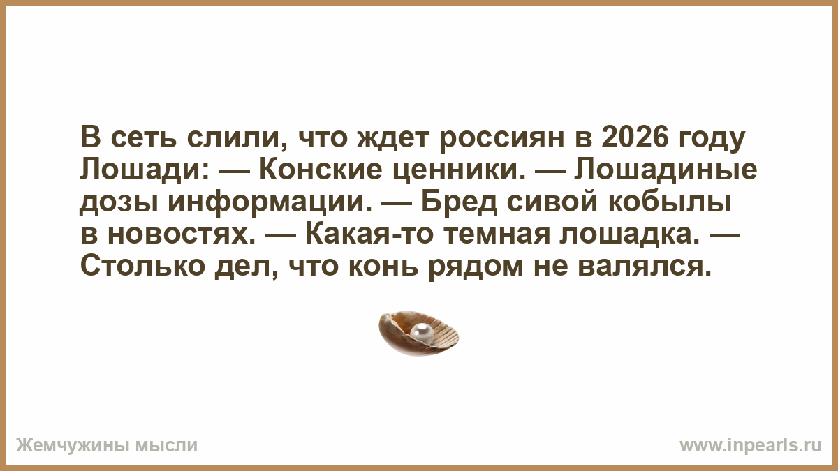 В сеть слили, что ждет россиян в 2026 году Лошади: — Конские ценники. — Лошадиные дозы информации. — Бред сивой кобылы в новостях. — Какая-то темная лошадка. — Столько дел, что конь рядом не валялся.