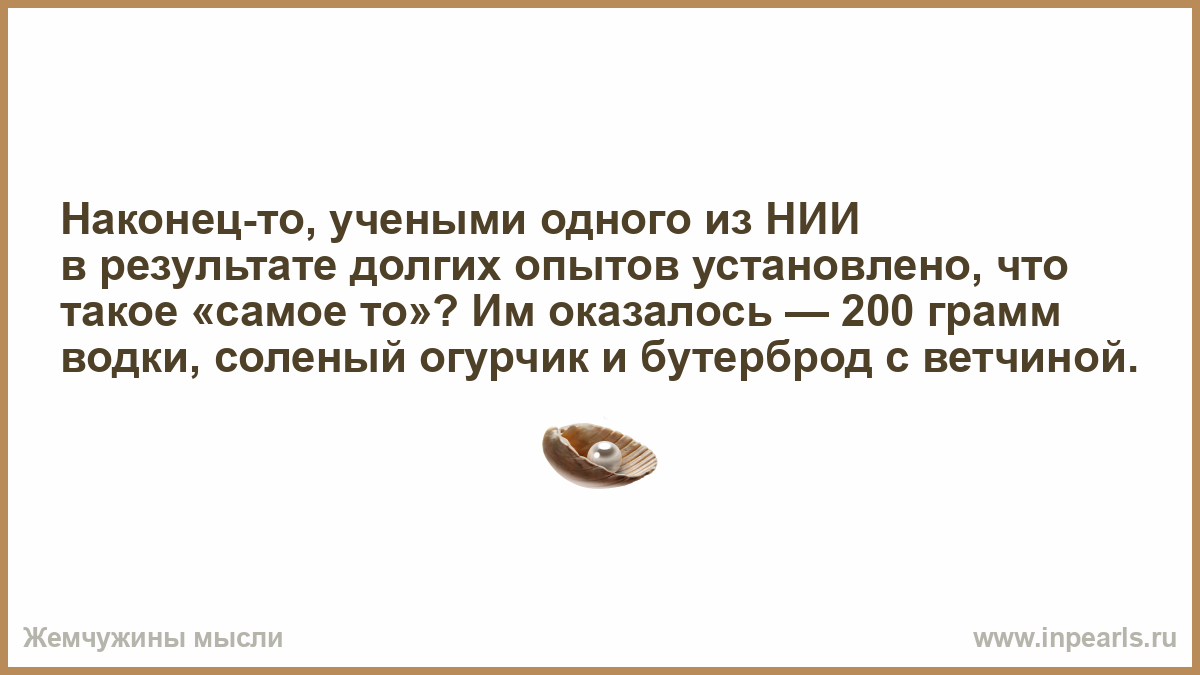 Наконец-то, учеными одного из НИИ в результате долгих опытов установлено, что такое «самое то»? Им оказалось — 200 грамм водки, соленый огурчик и бутерброд с ветчиной.