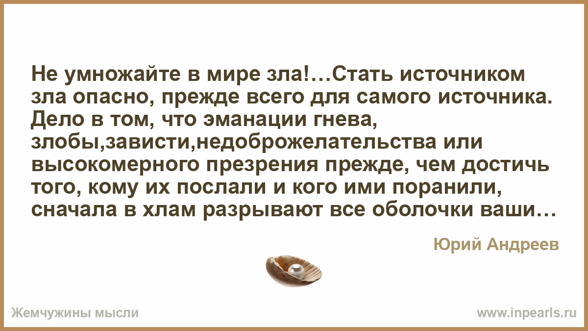 Не умножайте в мире зла!…Стать источником зла опасно, прежде всего для самого источника. Дело в том, что эманации гнева, злобы,зависти,недоброжелательства или высокомерного презрения прежде, чем достичь того, кому их послали и кого ими поранили, сначала в хлам разрывают все оболочки ваши, все тонкие тела, окружающие ваше плотное физическое тело. Решающим доказательством разрушительного и саморазрушительного воздействия ненавистных эмоций является другое :- эгоистичные, злые люди долго не живут, и конец их недоброй жизни отягощён целой связкой мучительных недугов. А если и живут, то человеческая ли это жизнь? Не умножайте количества зла и и вы сохраните здоровье!