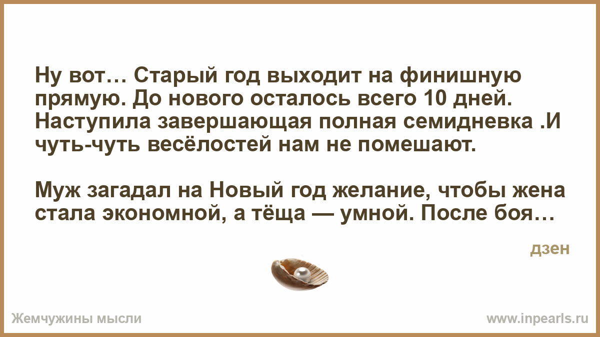 Муж загадал на Новый год желание, чтобы жена стала экономной, а тёща — умной. После боя курантов жена выключила телевизор, задула свечи, убрала со стола коньяк, а теща начала рассказывать подробности русско-турецкой войны 1877 года…