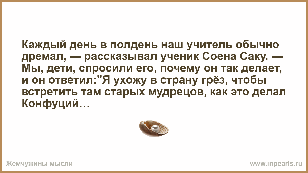 Каждый день в полдень наш учитель обычно дремал, — рассказывал ученик Соена Саку. — Мы, дети, спросили его, почему он так делает, и он ответил:"Я ухожу в страну грёз, чтобы встретить там старых мудрецов, как это делал Конфуций.»