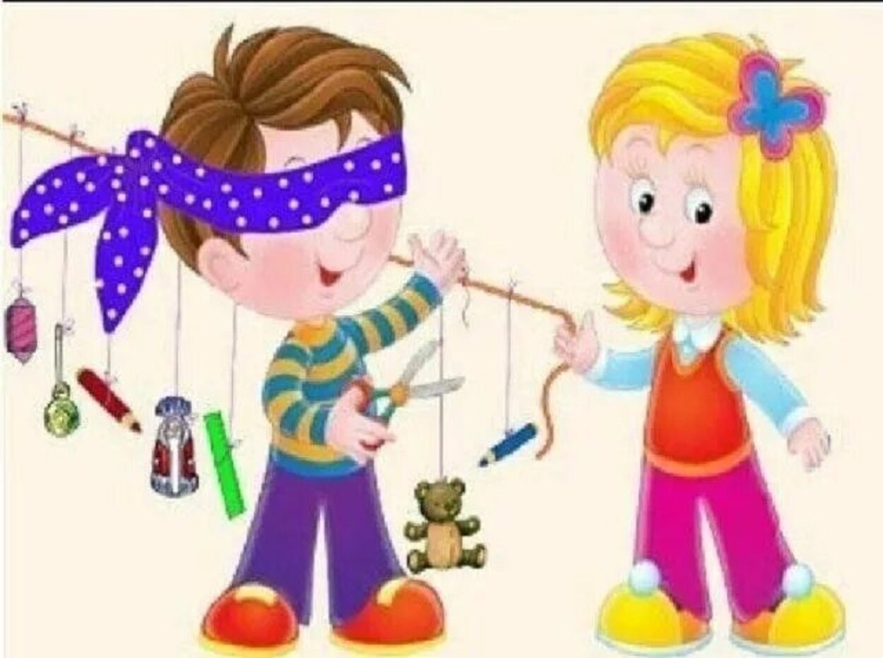 Из новогодних игр детства запомнилась игра, когда развешивали на тонкой веревке разные конфеты, сладости, игрушки, затем участнику завязывали глаза, покрутят его несколько раз, дадут в руки ножницы и он должен найти верёвку и срезать подарок.
