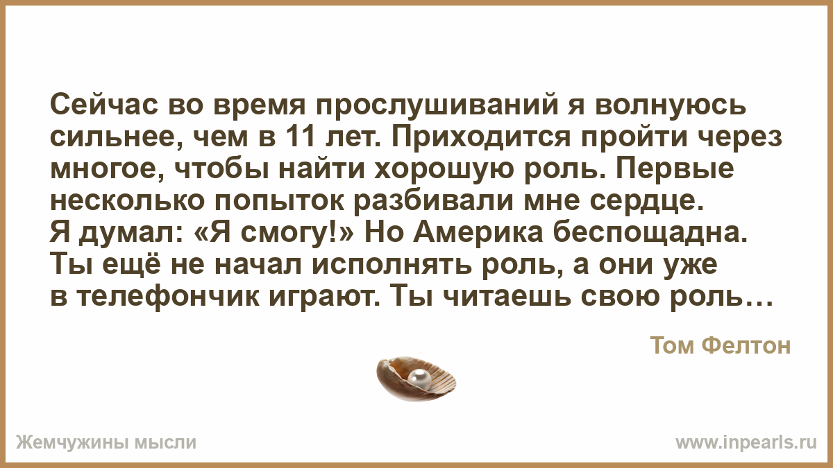 Сейчас во время прослушиваний я волнуюсь сильнее, чем в 11 лет. Приходится пройти через многое, чтобы найти хорошую роль. Первые несколько попыток разбивали мне сердце. Я думал: «Я смогу!» Но Америка беспощадна. Ты ещё не начал исполнять роль, а они уже в телефончик играют. Ты читаешь свою роль, бьёшься в конвульсиях, а тебе говорят: «Спасибо, перезвоним», что означает: «Проваливай, парень». Однажды прошёл 19 прослушиваний и получил 20-е лишь на фильм «Явление».