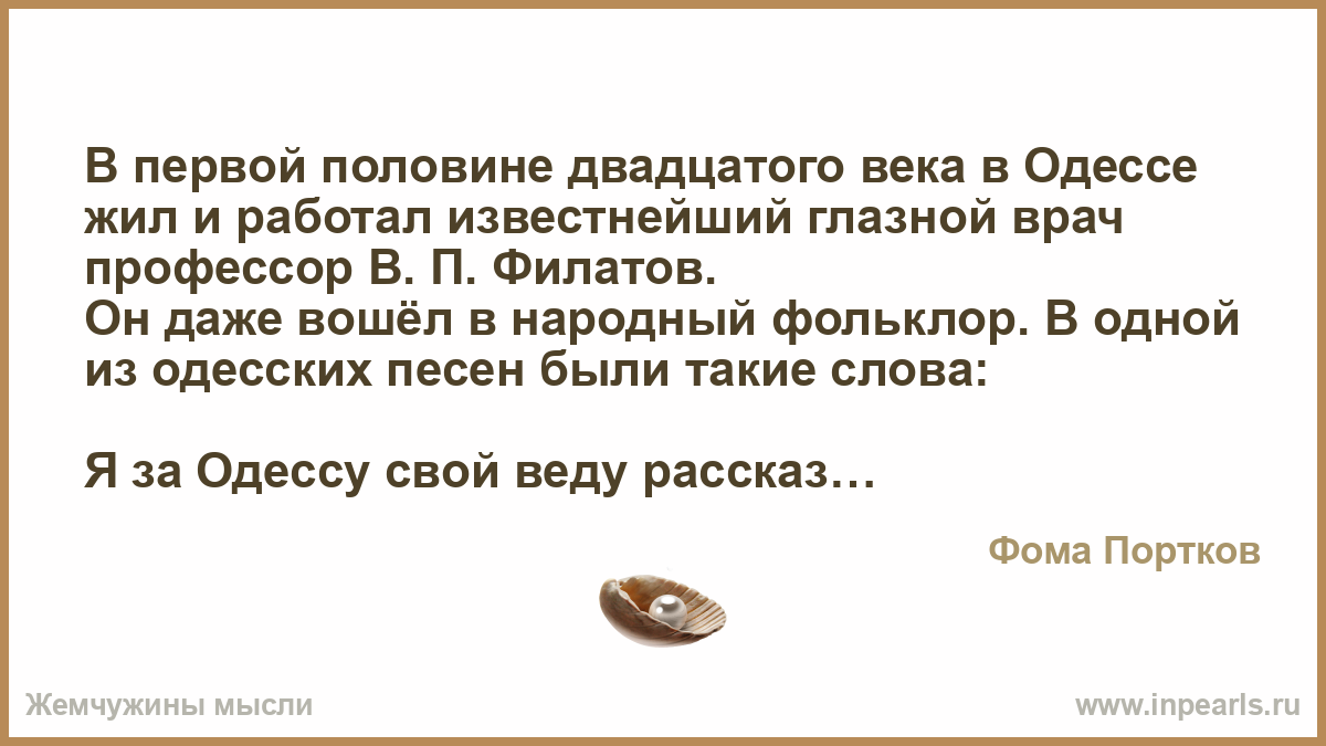 В первой половине двадцатого века в Одессе жил и работал известнейший глазной врач профессор В. П. Филатов.