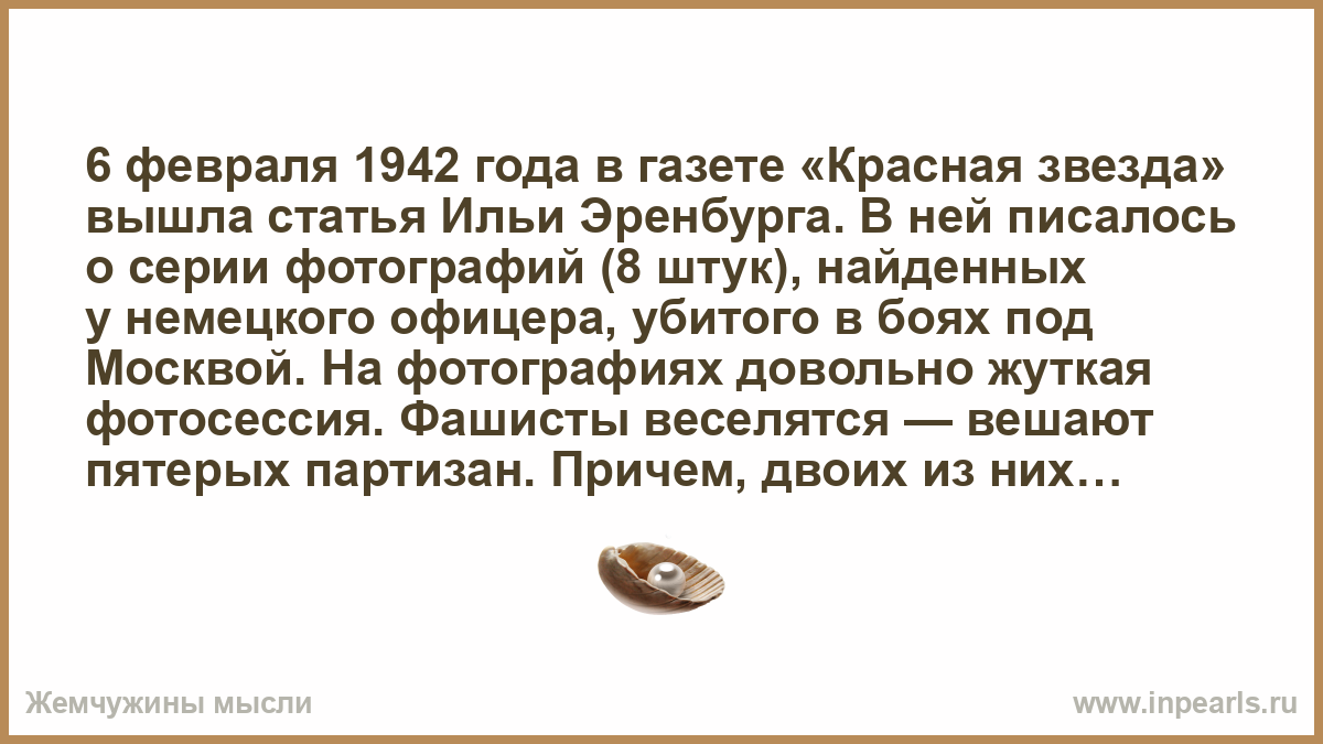 6 февраля 1942 года в газете «Красная звезда» выходит статья Ильи Эренбурга. В ней писалось о серии фотографий (8 штук), найденных у немецкого офицера, убитого в боях под Москвой. На фотографиях довольно жуткая фотосессия. Фашисты веселятся — вешают пятерых партизан. Причем, двоих из них пришлось вешать дважды — оборвалась веревка.