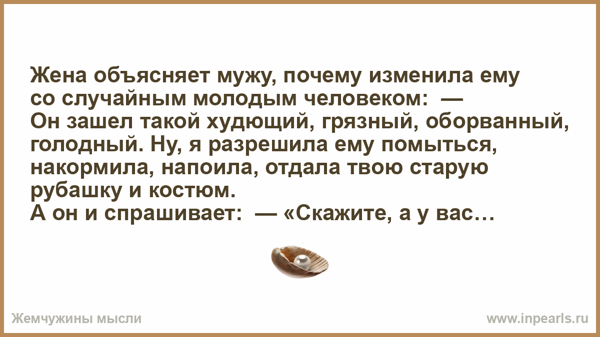 Жена объясняет мужу, почему изменила ему со случайным молодым человеком: — Он зашел такой худющий, грязный, оборванный, голодный. Ну, я разрешила ему помыться, накормила, напоила, отдала твою старую рубашку и костюм.