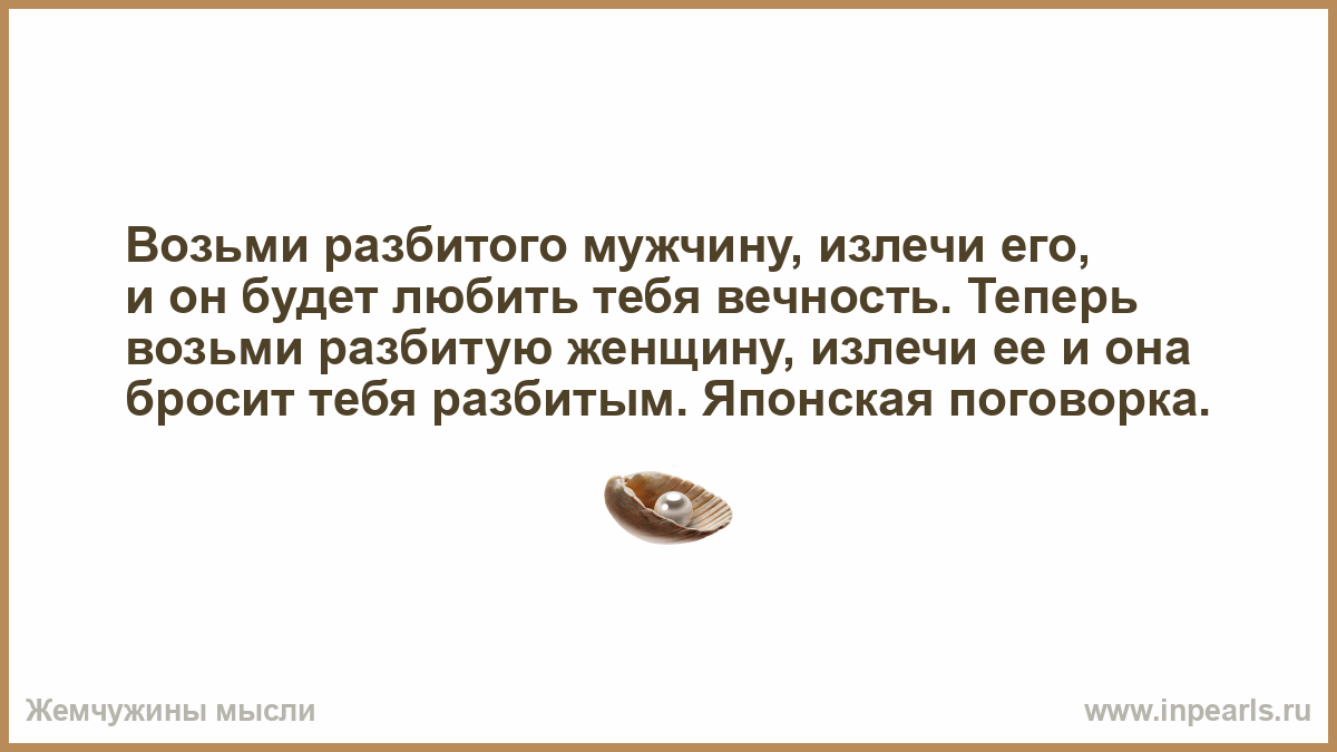Возьми разбитого мужчину, излечи его, и он будет любить тебя вечность. Теперь возьми разбитую женщину, излечи ее и она бросит тебя разбитым. Японская поговорка.